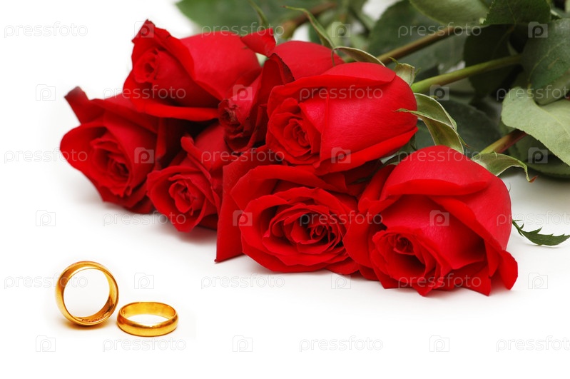 Букет красных роз и кольца на белом фоне