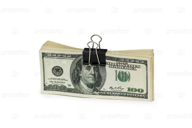 Пачка долларов, скрепленных скрепкой, на белом фоне