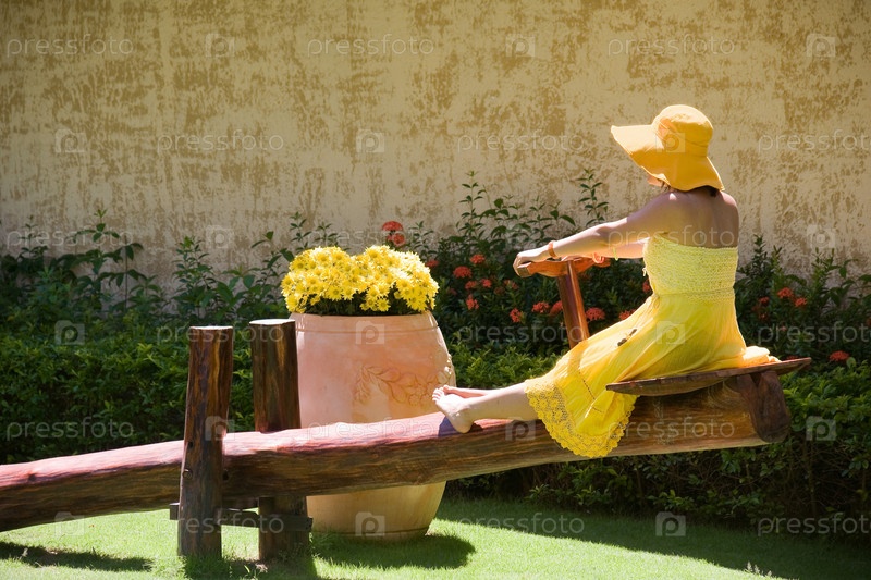 Женщина в желтом платье и шляпе качается на качелях