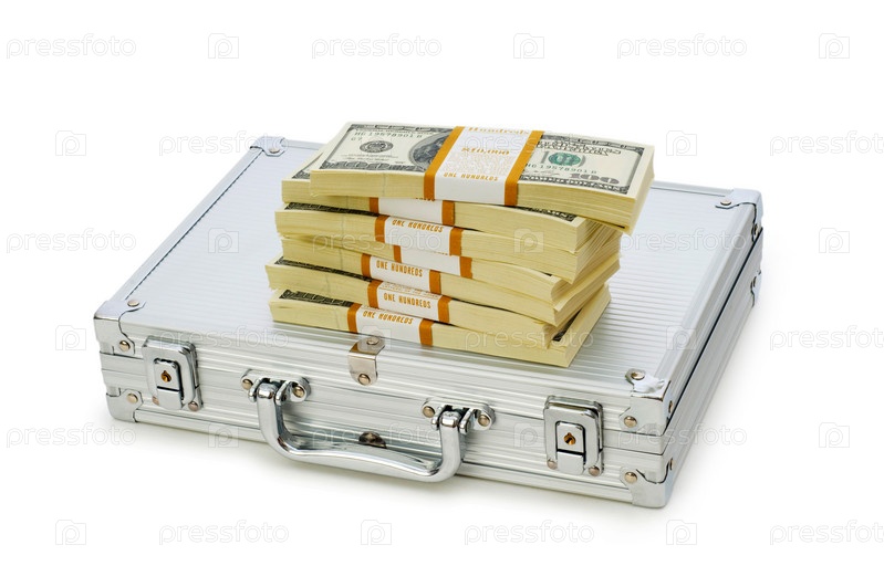 Металлический чемодан и пачки долларов на белом фоне