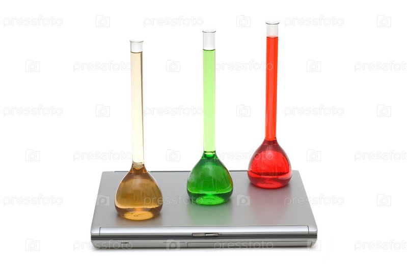 Колбы с жидкостями на ноутбуке на белом фоне