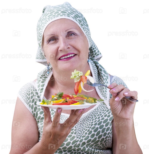 Женщина и вегетарианский свежий овощной салат на белом фоне