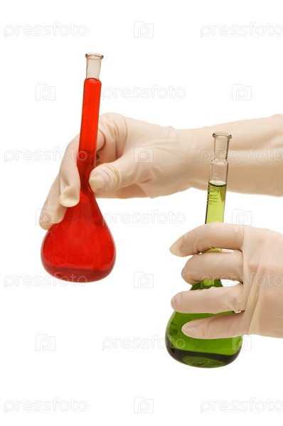 Руки в перчатках держат колбы с жидкостями на белом фоне