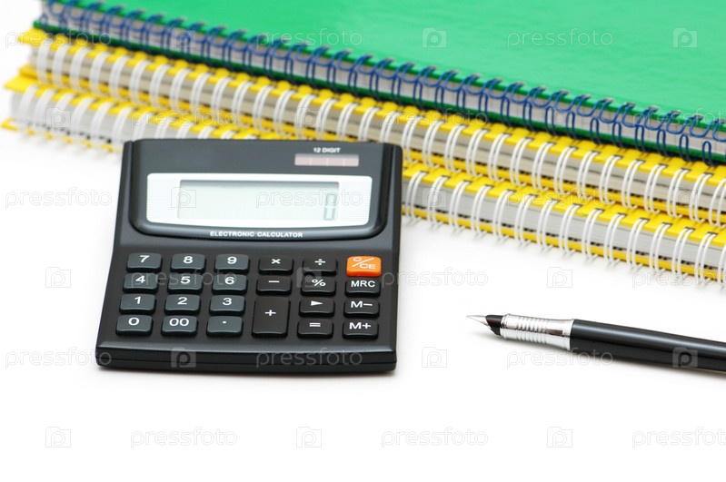 Калькулятор, блокноты и ручка, изолированные на белом