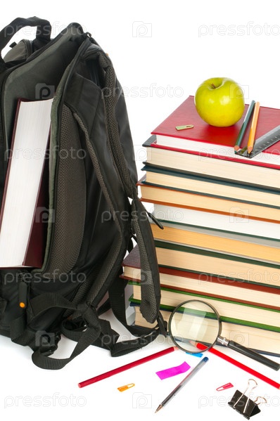 Книги, рюкзак и школьные принадлежности на белом фоне