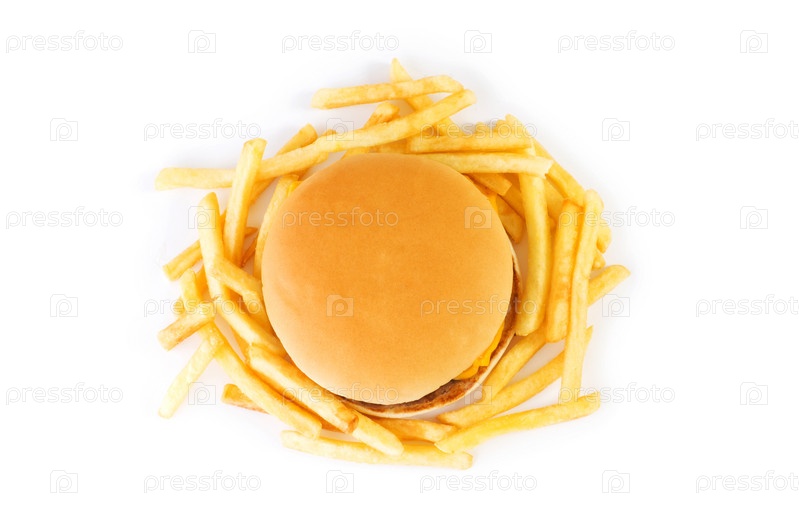 Чизбургер и картофель фри на белом фоне