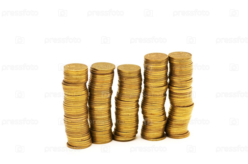 Стопки золотых монет на белом фоне