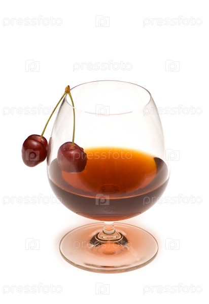 Бокал с вином и вишенками на белом фоне