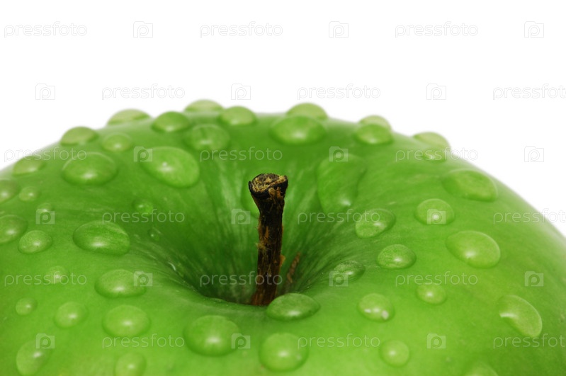 Зеленое яблоко с каплями воды на белом фоне