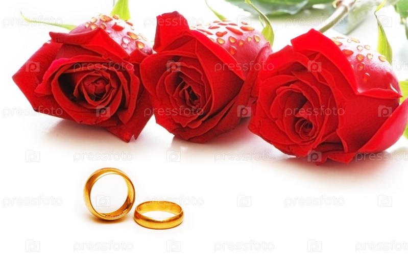 Три розы и обручальные кольца на белом фоне