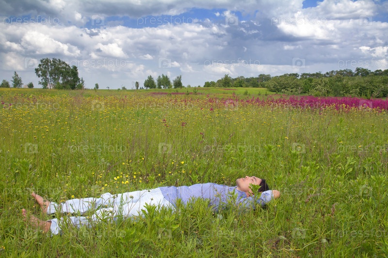 Мужчина лежит на весеннем лугу