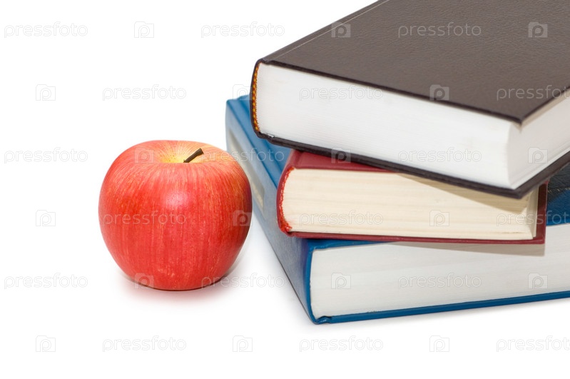 Книги и яблоко на белом фоне