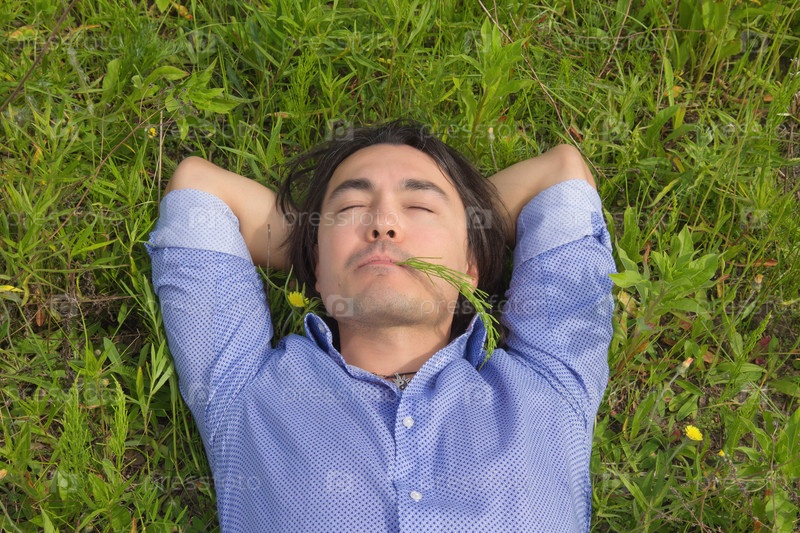 Молодой человек, лежащий на зеленой траве