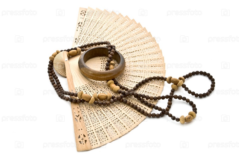 Открытый деревянный веер с бусами и браслетом на белом фоне