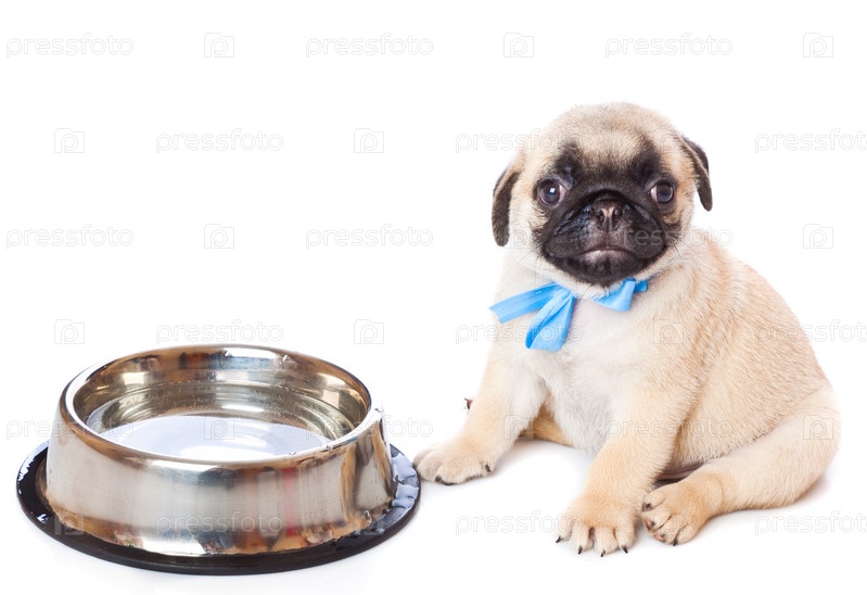 Щенок мопса у миски, изолированный на белом