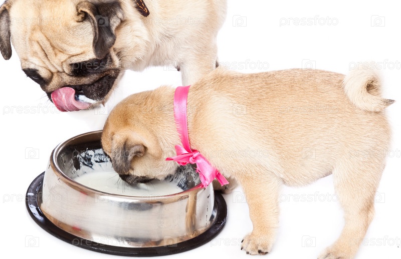 Щенок мопса пьет молоко из миски, изолированный на белом