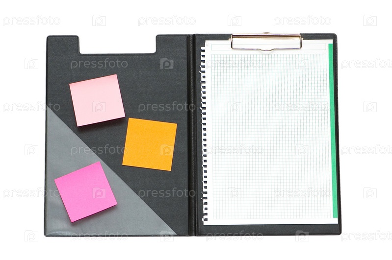 Открытая папка-планшет с разноцветными стикерами и листом в клеточку