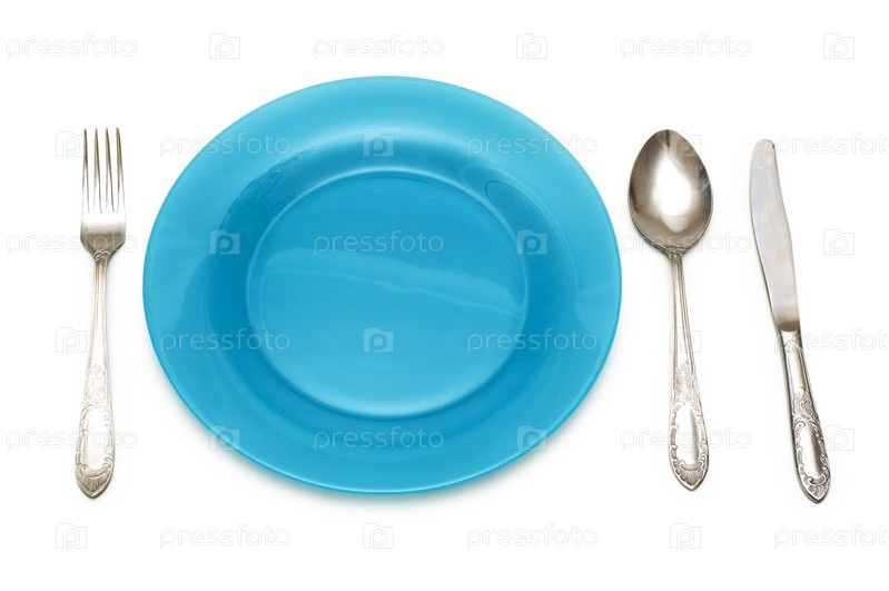 Голубая тарелка со столовыми приборами на белом фоне