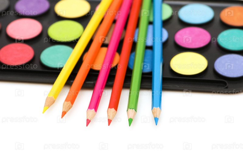 Акварельные краски и карандаши на белом фоне