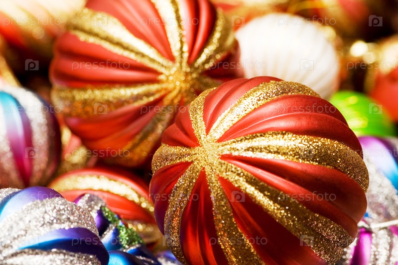 Много новогодних елочных шаров крупным планом