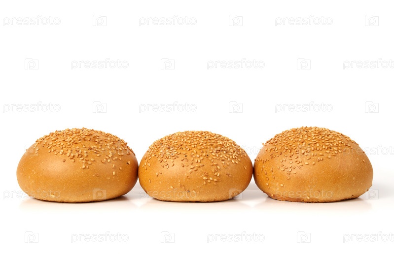 Три булочки с кунжутом на белом фоне