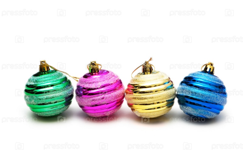 Четыре разноцветных елочных шара, изолированные на белом фоне