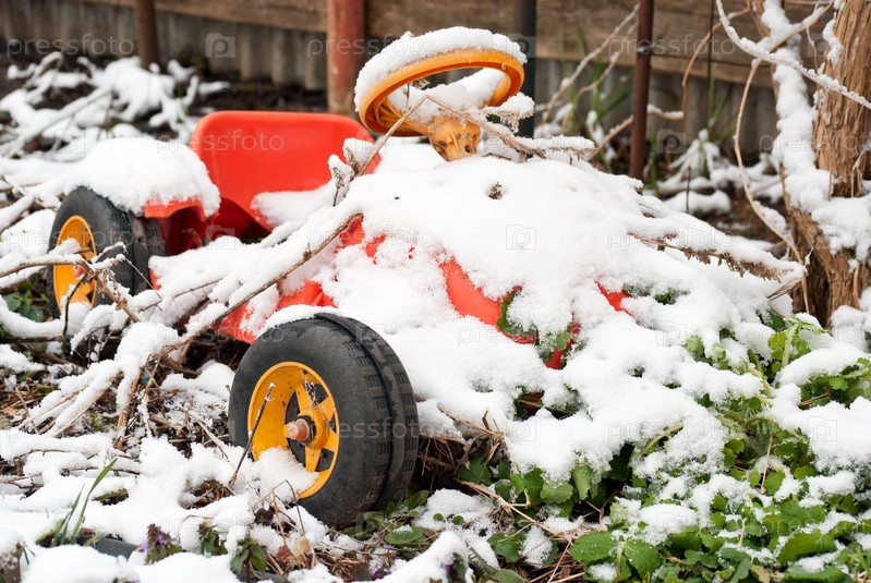Старый брошенный детский автомобиль в снегу