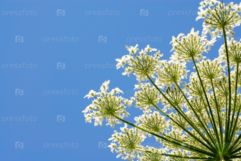 Белые цветки борщевика на фоне ясного голубого неба