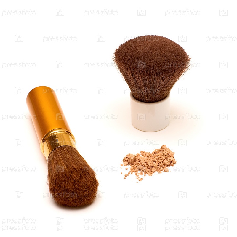 Две кисточки для макияжа с горсткой пудры, изолированные на белом фоне