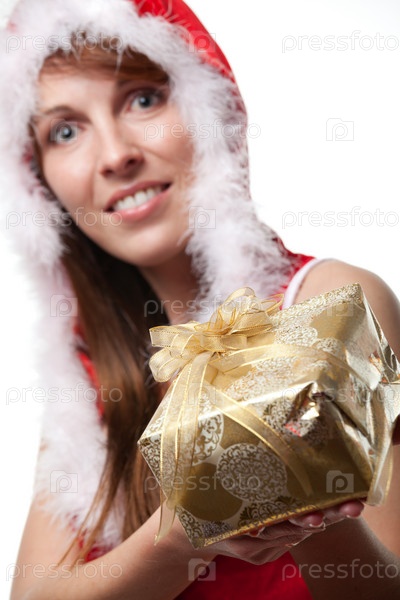 Женщина в новогоднем костюме держит подарок
