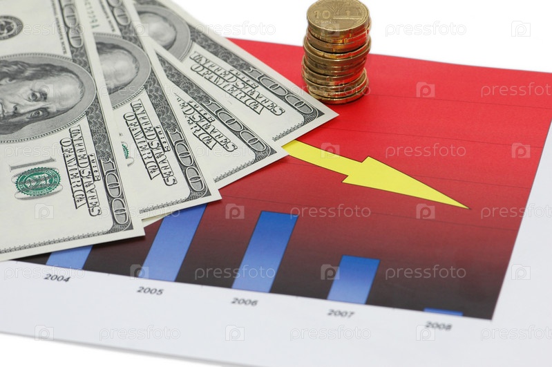 Сто долларовые купюры и стопка монет на фоне графика ифляции