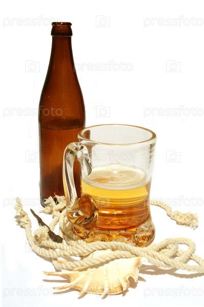 Бутылка, кружка,веревка,гвоздь и морская раковина на белом фоне