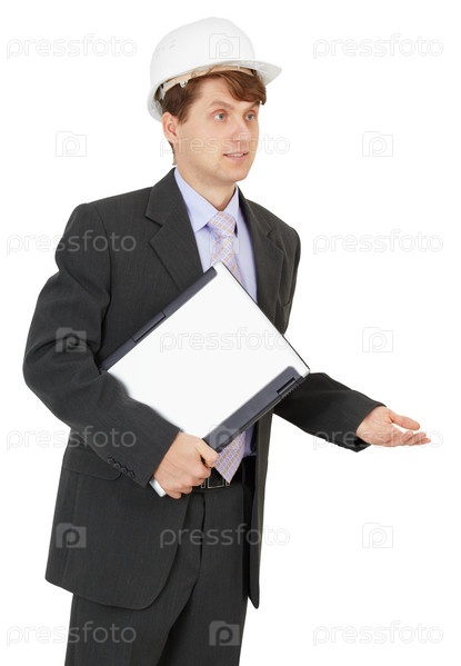 Молодой специалист в каске с ноутбуком