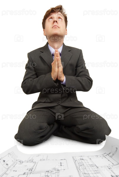 Инженер молится Богу, сидя на полу у чертежей