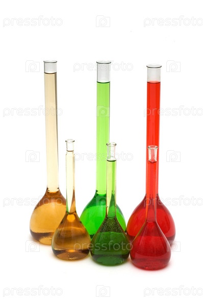 Колбы с различными жидкостями на белом фоне