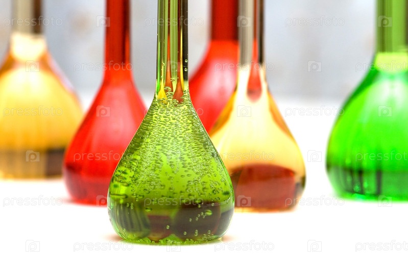 Колбы с различными жидкостями на белом фоне