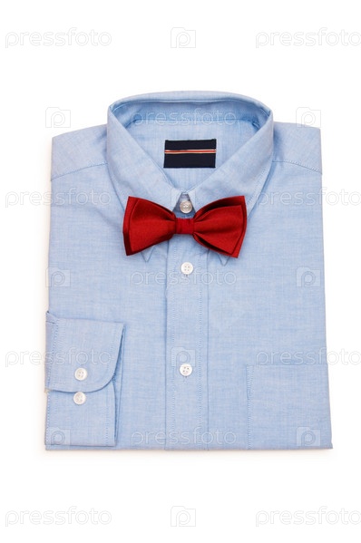 Голубая мужская рубашка и красная бабочка на белом фоне