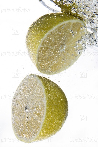 Половинки свежего лимона под водой на белом фоне