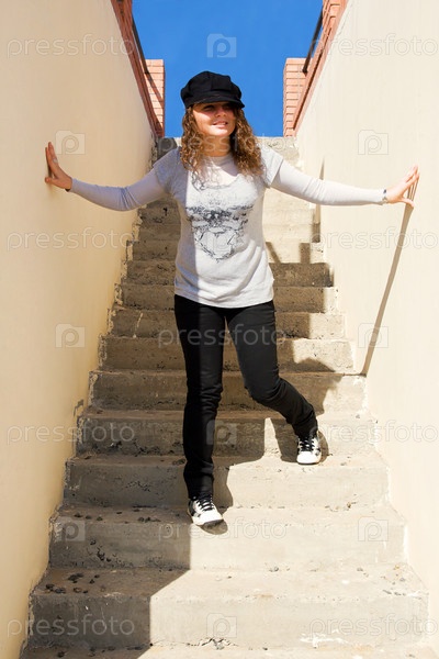 Молодая привлекательная девушка на ступенях лестницы в яркий летний день