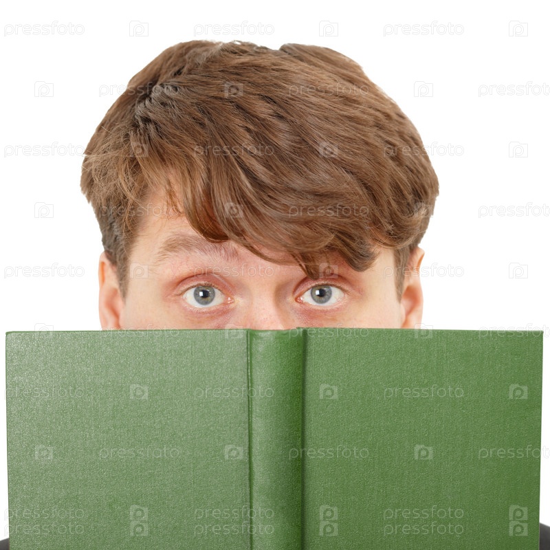 Молодой человек спрятал лицо за зеленую книгу