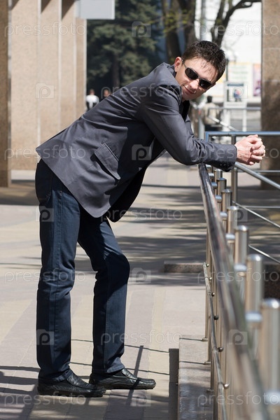 Молодой предприниматель опирается на поручни возле офисного здания
