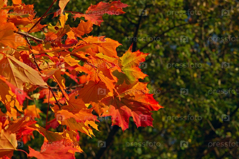 Огненные кленовые листья в контрасте с еще зеленым лесом