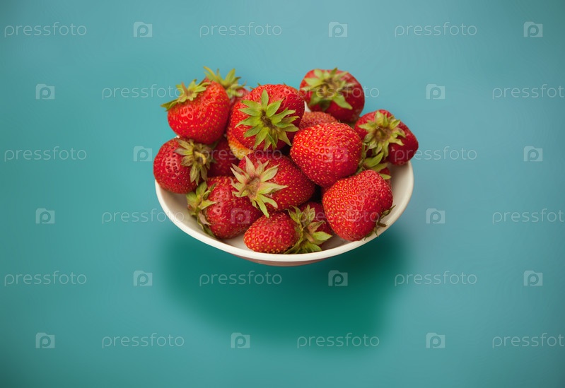 Клубника в миске на голубом фоне