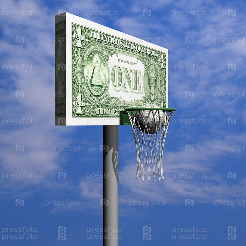 Долларовые баскетбольные щит, кольцо, сетка и мяч на фоне неба
