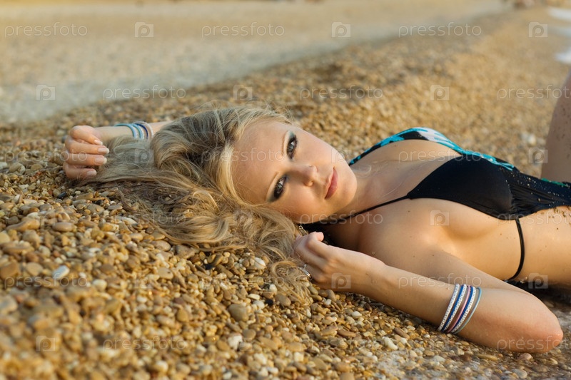 Блондинка в купальнике лежит на пляже