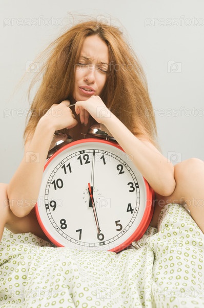 Красивая молодая женщина в постели с будильником