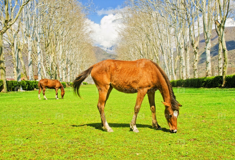 Лошади пасутся на зеленой траве на фоне красивого голубого неба и гор