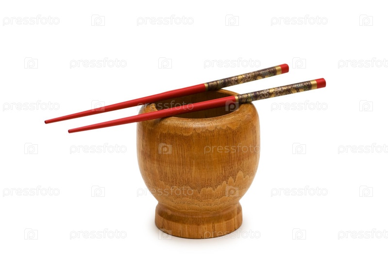 Чаша и палочки для еды на белом фоне