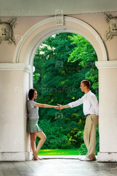 Молодая пара, держась за руки, стоит под аркой