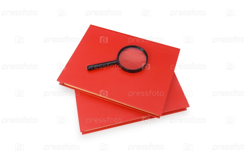 Лупа на красных книгах на белом фоне